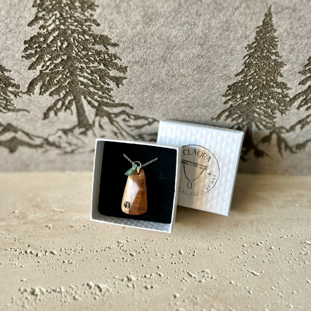Une création d'exception alliant terre, mer et lumière. Ce collier EclaOra marie la clarté solaire du bois d’olivier à la profondeur du prunier. Ce duo boisé est sublimé par une pépite de verre marin poli par l'océan et l'éclat pur d'un diamant zirconium. Monté sur une bélière en acier inoxydable argenté, ce bijou unique joue sur les contrastes entre textures organiques et brillance précieuse.