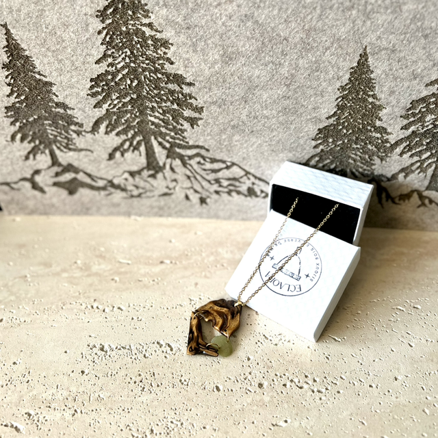 Une fusion sculpturale entre terre et océan. Ce collier EclaOra présente un design audacieux où une pépite de verre marin translucide est enserrée entre deux pièces de chancre de hêtre échauffé. Le contraste entre les veines noires du bois et la douceur du verre dépoli crée un relief unique. Montée sur une chaîne en acier inoxydable doré, cette pièce capture l'équilibre parfait des éléments.