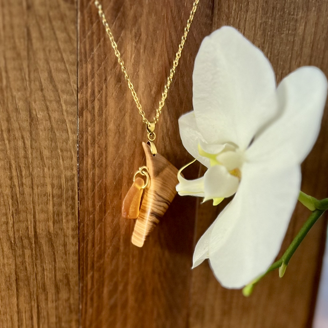 - Matériaux : Bois d'Olivier sculpté, Véritable Verre de Mer (couleur ambrée), Acier Inoxydable doré (chaîne incluse).