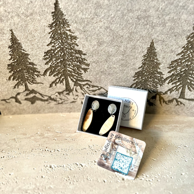 Ce bijou d'exception met à l'honneur la Racine de Molavé, un bois précieux aux teintes claires et lumineuses, délicatement marié à la brillance de l'acier inoxydable argenté. La superposition de deux formes ovales crée un design fluide et contemporain, parfait pour éclairer votre visage.